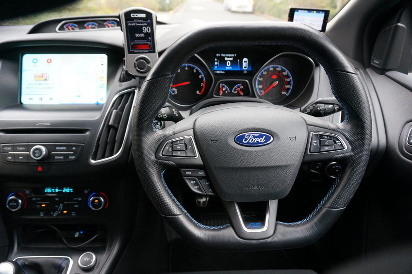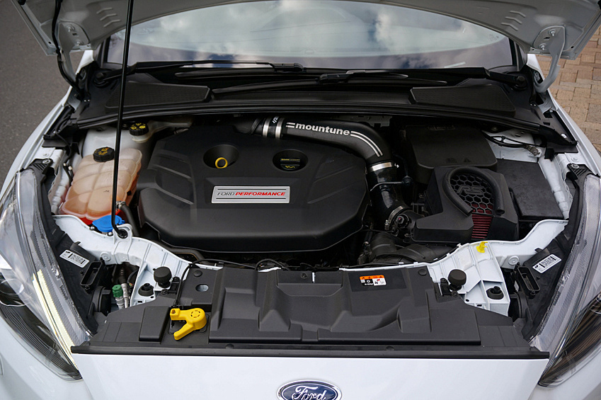 ツインスクロールターボやバリアブルカムシャフト等で武装した直噴2.3Lのエコブーストエンジンは、350ps/6800rpm、440Nm/2000-4500rpm(OB時470Nm)を発しますが、『mTuneハンドセット』や『高効率インダクションキット』等が含まれた『mountune M380 アップグレードキット』をインストールしているので、380ps/530Nm(OB時)へパワーアップ、そして0-100km/hは4.7秒から4.5秒以下へタイムアップしております。アンチラグシステムによる継ぎ目の無い加速感は鳥肌モノです。もちろん不具合はありません。