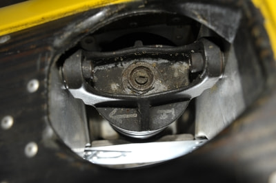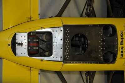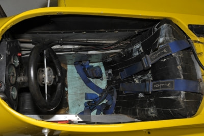フロントノーズコーンのアッパーカバーを外すと、上部のCFRPと下部のアルミがムキ出しに。ペダル類やブレーキオイルメンテナンス用の穴が空けられている。モノコックは、外観上では劣化は少なさそうだ。
