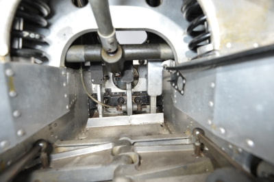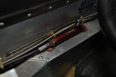 ペダル類はオルガン式。右からアクセル、ブレーキ、クラッチ。足もとは意外に広いが、ペダル間の間隔は見た目以上に非常に狭く感じる。両脇にスプリングダンパーユニットがあり、スプリングに書いてある「700」という数字はおそらくスプリングレート(ポンドパーインチ=lbs/inch)と思われる。700 lbs/inchだとすると、約12.51 kg/mmとなり、意外に硬くない印象だ。