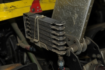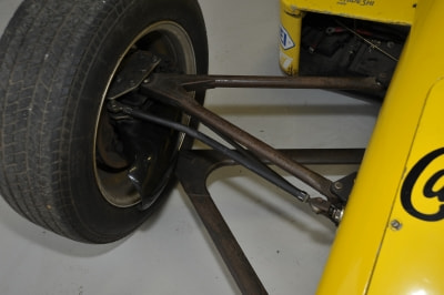 フロント右側のサスペンションアーム類。アーム類はスチール製で、製造から25年経過した現在はさすがに錆がある。タイロッドが曲がっていたが、これはオーナーが購入後にサーキット走行した時のダメージかと思われる。移動用のトラベルタイヤとホイール、クーリング用のシュラウドが装着されていたため、ブレーキ関係の程度は確認できなかった。