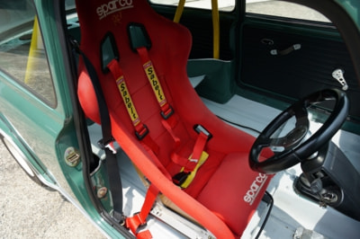 モスグリーンのボディカラーにオフホワイトのホイール、そして赤いフルバケットシートにイエローのロールケージと、クラブマンレーサーを語るには充分過ぎるほどセンスよくまとまっている本車両。しかも、ミニにありがちなサビや塗装浮きもほとんど無いので、パリッと仕上がっている。