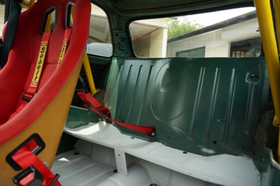 内張りを剥がしたノリ跡が少々残っているものの、ホワイトに塗装された床面や各所に奢られたアルミパーツ等のスポーティーな装いと、ダッシュボードまわりのノーマルのレトロな雰囲気が融合し、オシャレにまとまっている。