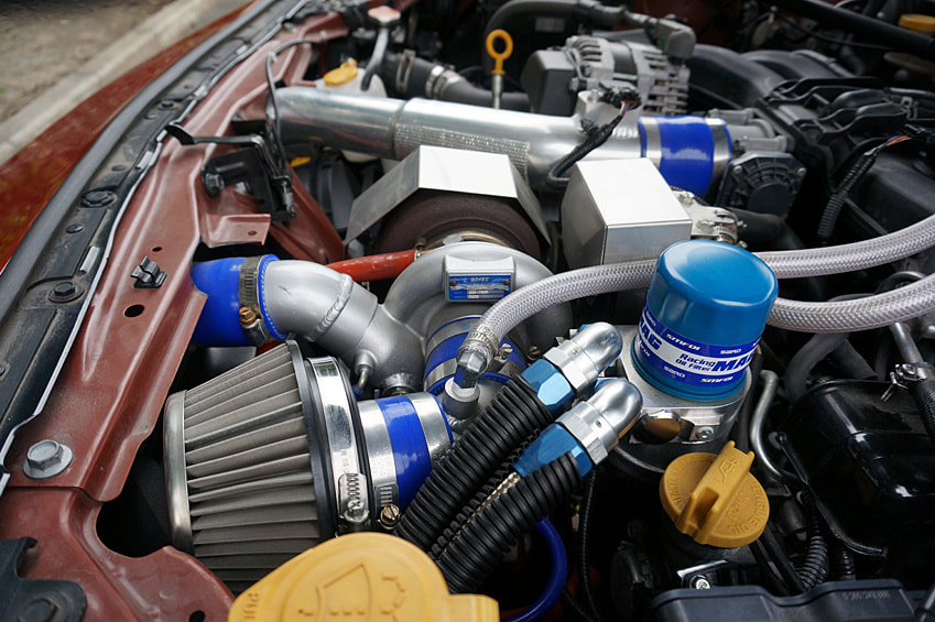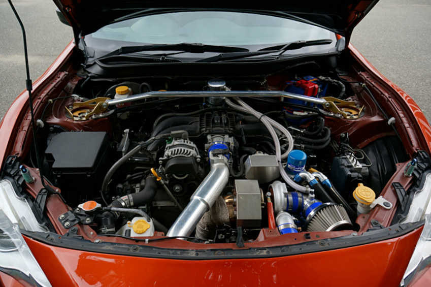 重心高460mmという超低重心化の実現と、ボクサーエンジン初のリッター100psも実現した水平対向4気筒DOHC2.0リッターのFA20型は、最高出力200ps/7,000rpm、最大トルク20.9kgm/6,400〜6,600rpmを発する高回転型NAユニットだが、本車両はブリッツ製の専用ターボシステムをボルトオン装備。エンジンやインジェクターなどはノーマルながらも約50psのエクストラパワーを得ている。