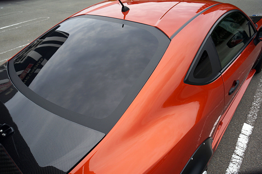 オレンジメタリックとカーボンのコントラストによってレーシーさが増したボディは、ランボルギーニ・ディアブロのように大きくくり抜かれたリヤバンパー周りや、ブラックのオーバーフェンダーによって、写真では感じとることのできない奥行き感のある迫力を感じとることができる。