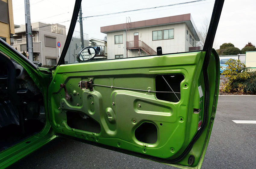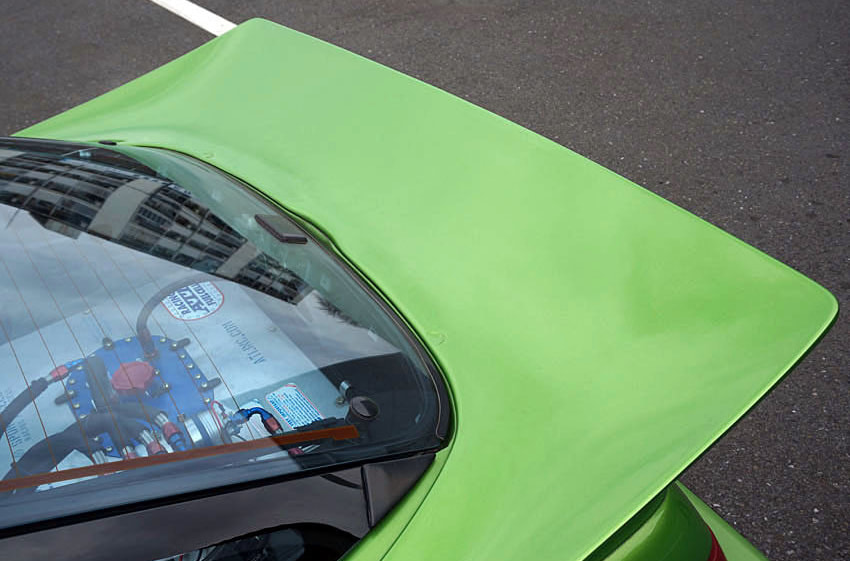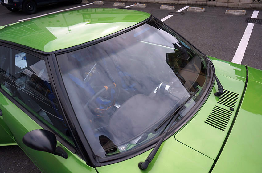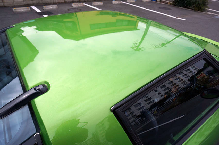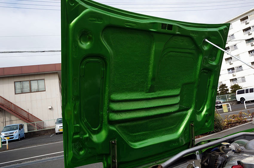 メルセデスベンツの純正色にオールペイントされたメタリックグリーンの外装は、一部でヒビも若干確認できるが、ツヤも十分あり、総じてキレイな状態が保たれている。
