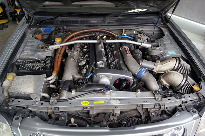 名機RB26DETTを低速域から全域トルクフルにするべく、ドラッグレース界でも名の知れた某ショップにてフルチューンを敢行。セドリックなどに搭載されたRD28クランクシャフトを加工し2925ccまでストロークアップ。コンロッドなども専用品を使用し、大容量インジェクターやハイカム、HKS製GT-SSタービンやRB25用純正NVCSなど1,000万円以上を投じ、FコンVプロ制御によって、ブースト1.6キロ時にパワーは587ps/5513rpm、トルクは87kgm/4679rpmを叩き出す珠玉のユニットと化している。パワーウェイトレシオにするとR35GT-Rニスモと同じぐらいなので、その炸裂感がいかほどかを窺い知ることができよう。ちなみに、より風量の大きいタービンへの換装とECUのリセッティングぐらいで600psオーバーも狙えるぐらい、チューニング内容にはマージンが十分とられている。