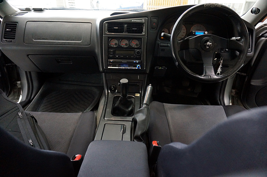 社外のステアリングやシフトノブなど以外は、ほぼ純正を保っているコクピット。お馴染みの3連メーターも純正のまま現在も稼働している。ちなみに、ミッションはもちろん5速MTだが、大パワーをロス無く路面に伝えるべく、オートギャラリー横浜製の690ミッションとHKS製のLAツインプレートクラッチに換装。精度の高いミッションになった事で、車内が静かになり、クラッチ操作もラクになったという。ちなみに、ステアリングコラム上には、ブリッツSBCがマウントされており、簡単に設定ブーストのモード切り替えを行える。普段はLo設定のブースト1.1キロで十分とのことだが、それでも約480ps/65kgmという持て余す程のパワーだ。