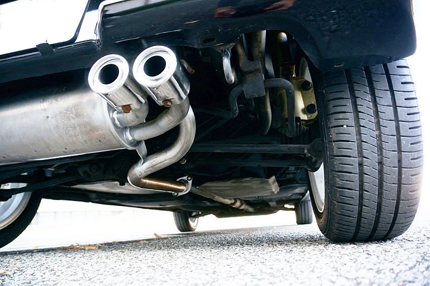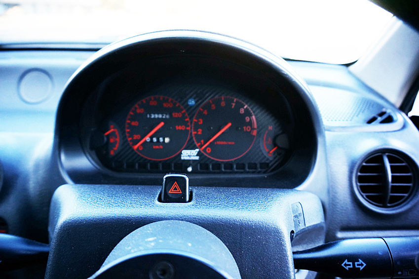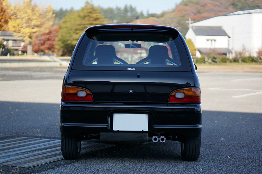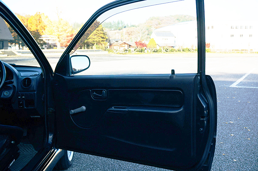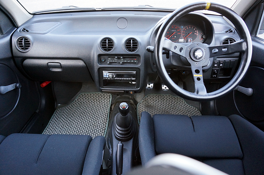 momoのディープコーンステアリングや新井モデルといわれるSTI製ジュラコンシフトノブ以外はほぼ純正のコクピット。エアコンもオーディオも稼働している。ミッションはRX-RA純正5速クロスミッション。純正とはいえ、ミッションの唸り音が車内にレーシーに響き渡り、加速の伸びやかさやコーナリング時の安定感といい、軽自動車に乗っていることをいつの間にか失念してしまうほどスポーティーな走りを繰り出す。