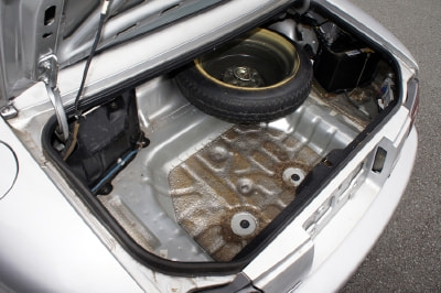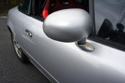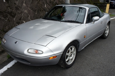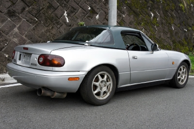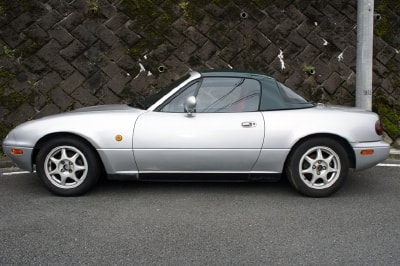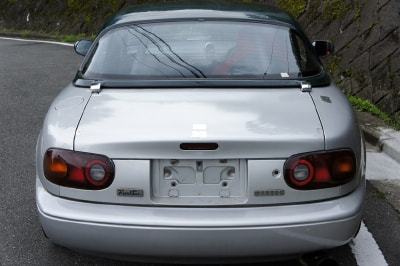 ロードスターの初期モデルなので、外装は年式相応の程度ではあるものの、サビなどでグサグサになっていたり、大きなヘコミや歪みがあるわけではなく、シルバーの塗装が若干剥げている箇所があるだけで、ボディに大きなダメージはない。
