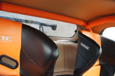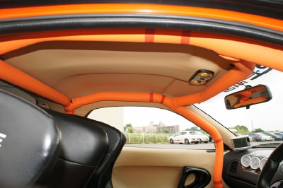 内装もボディ同色のロールケージや追加メーターなどの機能パーツを設置。チューニングカー独自の雰囲気を演出しつつ、フロアからルーフまで、フルカスタマイズ。ベージュ色のカーペットが隙間無く敷き詰められており、高級感が漂う。