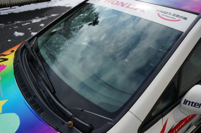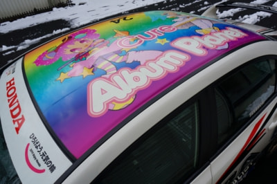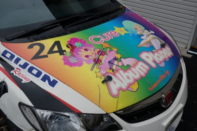 スポンサードされたデカール類に埋め尽くされたボディには、ディジョンレーシングとしてはお決まりの“萌え”系キャラクターものも大きく貼られているものの、チャンピオンカーとしての風格を感じるような傷跡が多数残されていて、これはこれで非常にレーシー。